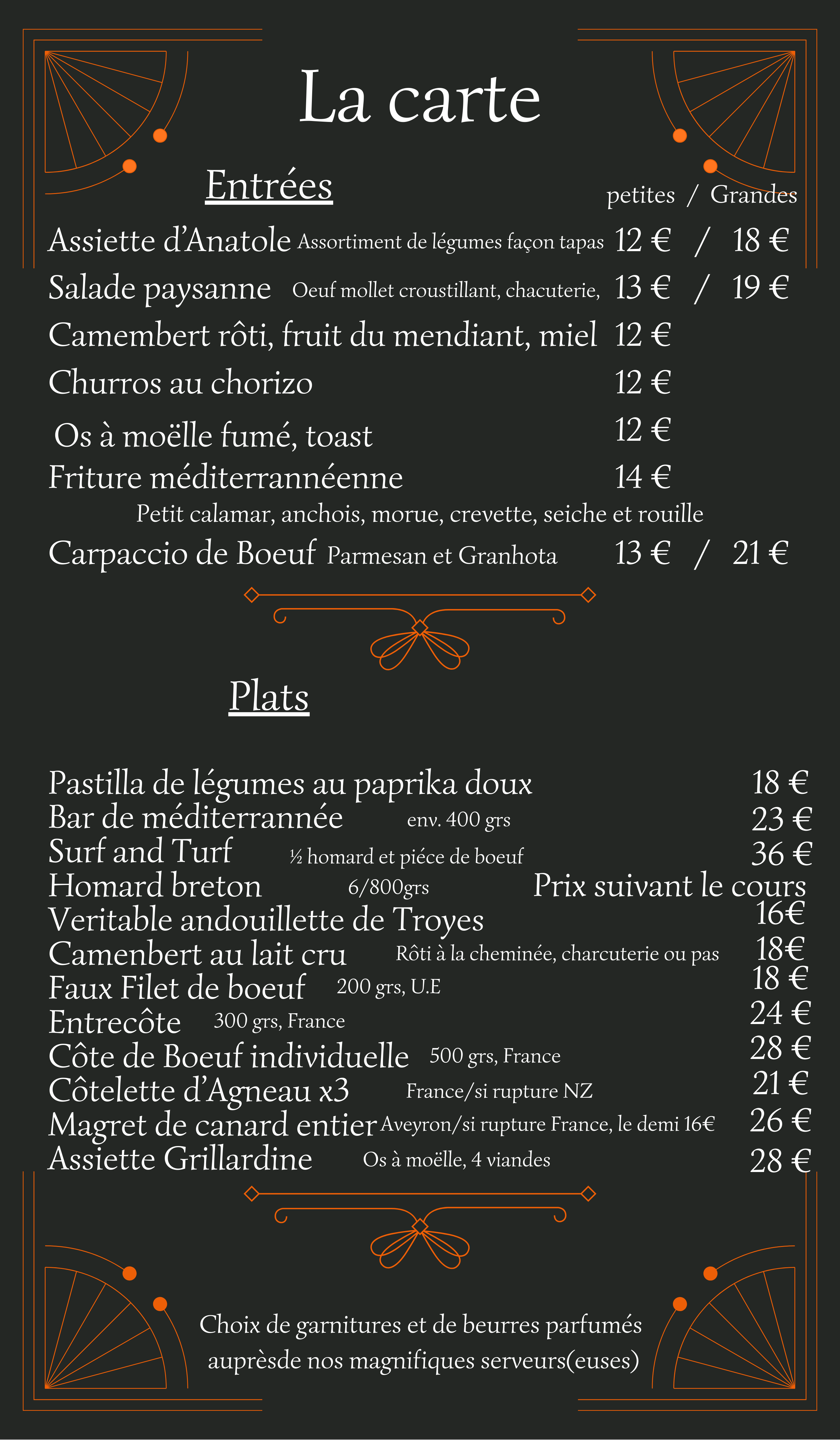 Un accueil chaleureux vous attend à Assiette d'Anatole . Nous sommes ravis d'être votre hôte à PEZENAS ! Préparez-vous à être captivé par notre délicieuse sélection de cuisine française. Découvrez des plats délicieux servis par notre personnel amical. Amenez vos amis et votre famille pour déguster de savoureuses grillades. De la bière rafraîchissante, du vin, du café et du thé sont également disponibles pour votre plaisir. Dans un cadre calme et reposant, savourez un déjeuner et un dîner savoureux.